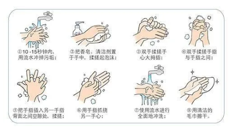 洗手方法:采用流动的清水,并使用肥皂、洗手液洗手或者使用含有酒精成分的免洗手液。一定要避免脏手接触口、鼻、眼等。洗手采用专业洗手法:即“内-外-夹-弓-大-立-腕”。