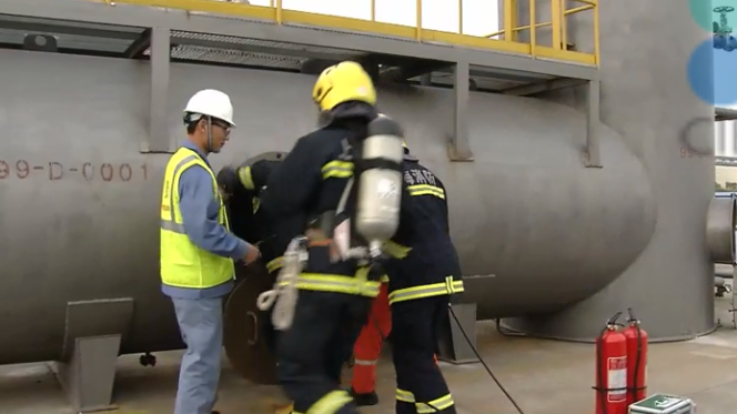 9、一旦发生人员中毒、窒息的紧急情况,抢救人员应佩戴空气呼吸器或隔离式防护面具等防护用品。进入受限空间,并至少有1人在外部做联络工作。