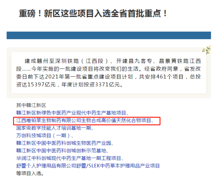 近日,江西省发改委下达2021年第一批省重点建设项目计划,位于赣江新区-中国(南昌)中医药科创城的k1体育官网生物合成高价值天然产物项目入选!