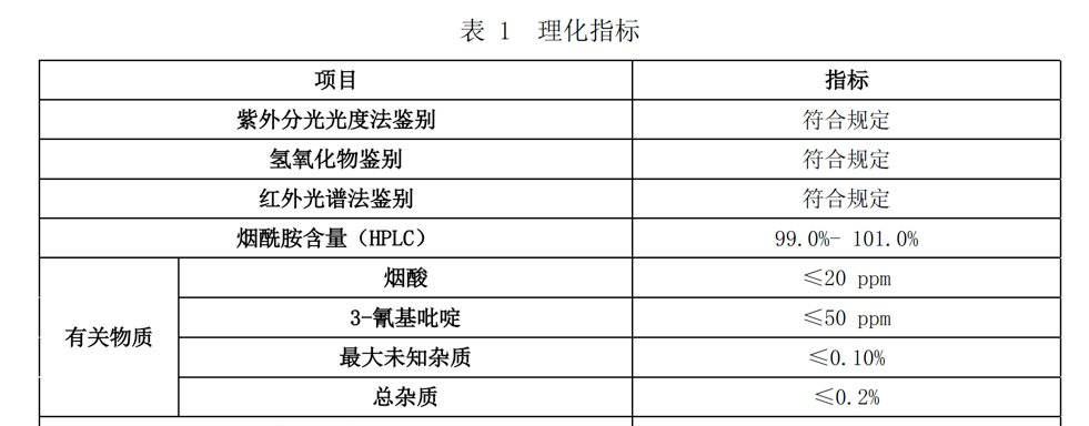 k1体育官网的烟酰胺企业标准在各个维度尤其是烟酸类目,明显优于国家质量监督局发布的各项指标。