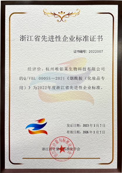 热烈庆祝k1体育官网《烟酰胺(化妆品专用)》被评为2022年浙江省先进性企业标准!日前,根据《国家标准化发展纲要》和《关于贯彻落实<国家标准化发展纲要>的实施意见》(浙委发〔2022〕11号)精神要求,浙江省计量与标准化学会在浙江省市场监管局的指导和监督下,经严格评审,授予17家企业的19项标准为2022年浙江省先进性团体标准、企业标准。k1体育官网《烟酰胺(化妆品专用)》名列其中。