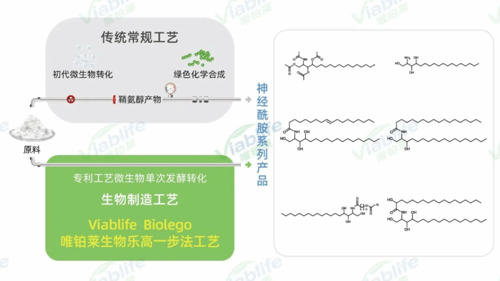 传统神经酰胺生产工艺受限于鞘氨醇生物发酵和化学反应的随机性的低效性,导致神经酰胺纯度低、杂质复杂,进而引发配方稳定性差、功效打折、安全隐患等多重问题。