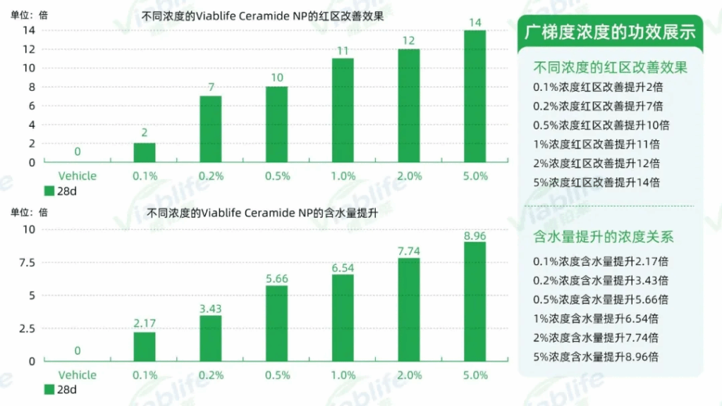为了测试不同浓度下k1体育官网神经酰胺NP的功效,k1体育官网设置了0.1%、0.2%、0.5%、1%、2%和5%七个浓度的实验品,结果显示,与使用安慰剂相比,使用后皮肤红区面积改善最高实现了14倍的提升;角质层含水量最高实现了8.96倍的提升。