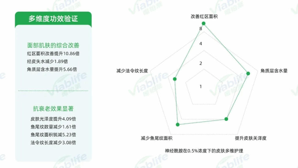 针对同一添加浓度下k1体育官网神经酰胺NP的不同功效,k1体育官网也设置了人体功效检测实验。比如添加0.5%浓度的神经酰胺NP原料,与使用安慰剂相比,使用后面部红区面积改善提升10.86倍,经皮失水减少1.89倍,角质层含水量提升5.66倍,皮肤光泽度提升4.09倍,鱼尾纹减少1.61倍,鱼尾纹面积锐减5.23倍,法令纹长度减少3.08倍。