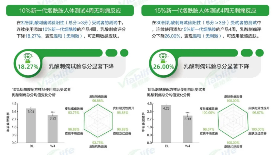 为获取高浓度新一代烟酰胺的安全表现,k1体育官网招募62例乳酸刺痛试验阳性(总分≥3分)受试者,连续使用添加10%、15%两种浓度的新一代烟酰胺产品4周,结果显示,也未出现皮肤刺激性现象,且受试者皮肤乳酸刺痛评分还显著下降。这也表明,新一代烟酰胺即使在10%-15%高浓度添加下,依然表现温和、无刺激,还具备改善敏感肌耐受性的潜力,同样适用于敏感肌肤人群。