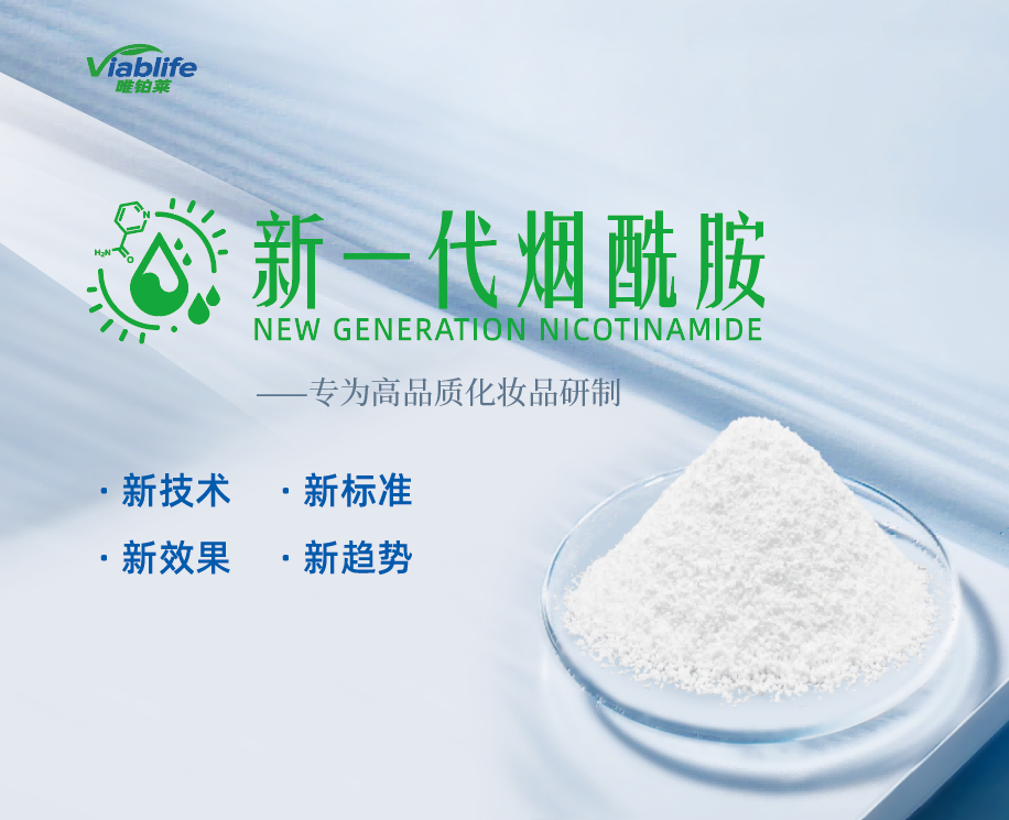 新技术:Viablife Biolego?引领烟酰胺绿色生物智造潮流;专线专产,专为高品质化妆品研制;7项核心专利赋能,科技创造更多美好。