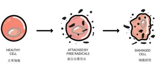 当人体自身机能无法清除过量的自由基时,它们就会向细胞成分发动进攻。自由基都带有不稳定的电子,会夺取细胞成分中的电子来使自己稳定下来,这也导致了人体内原本正常的物质因为失去电子而发生异变,如皱纹的产生:当自由基夺取了正常皮肤细胞蛋白分子的电子时,就会导致蛋白质形成畸变蛋白构象而成为新的自由基,这个新自由基又会去夺取临近正常分子的电子,形成大面积的蛋白纤维非正常伸展,最终导致肌肤骨架塌陷,产生皱纹。