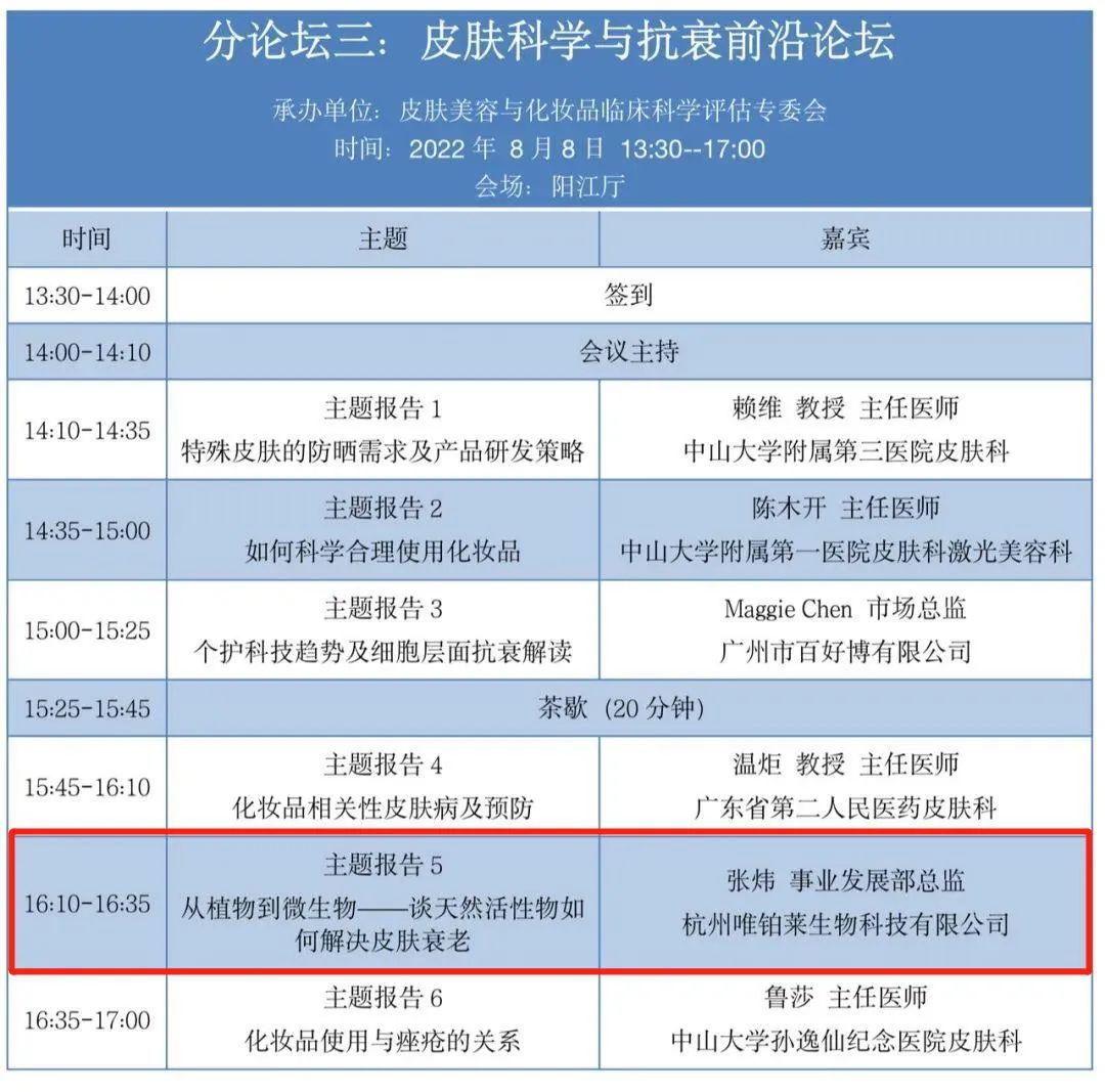8月8日16:10-16:35,第六届中国(白云美湾)化妆品国际高峰论坛——分论坛三“皮肤科学与抗衰前沿论坛”,k1体育官网事业发展部总监张炜将以“从植物到微生物——谈天然活性物如何解决皮肤衰老”为主题进行演讲。届时,论坛现场将同步直播,感兴趣的小伙伴们可重点关注,千万不要错过!