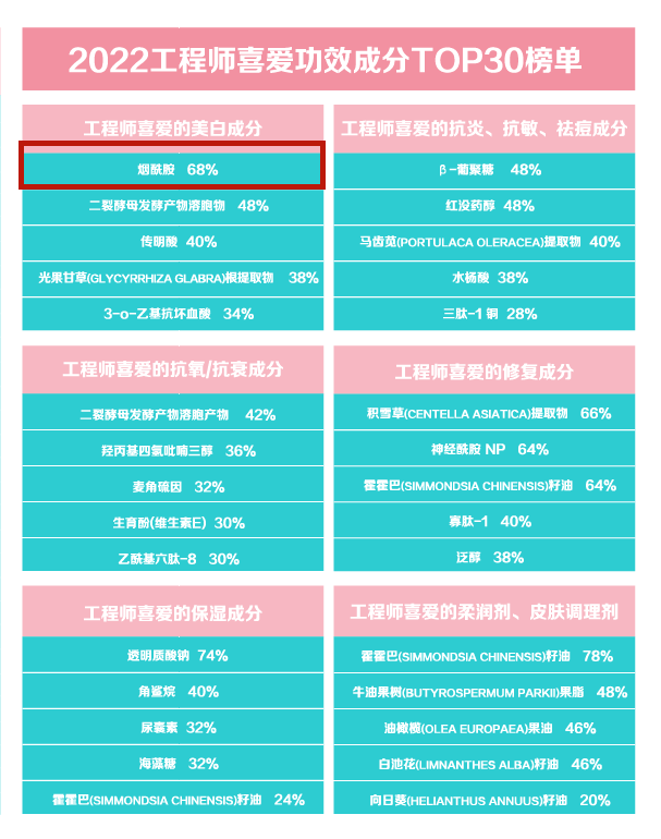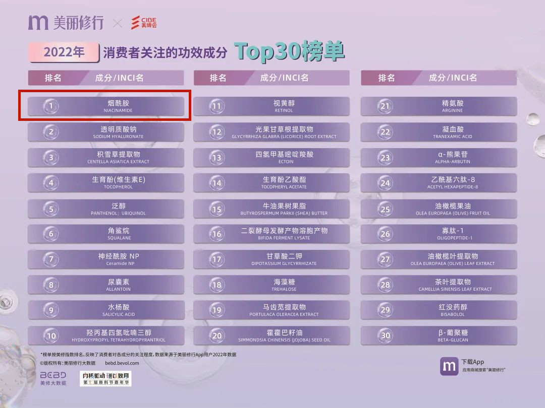 其中,由中国国际美博会主办,百阜福瑞达支持的“内核驱动 研以致用——第七届原料节嘉年华”活动颁布了两大榜单:2022年消费者关注的功效成分Top30以及2022工程师喜爱功效成分Top30。作为功效护肤原料“常青树”——烟酰胺,首当其冲,成为两大榜单的Top1!