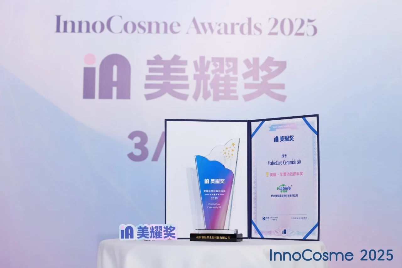 本届美耀奖吸引110+选手参与申报,大众投票数量高达500万+,竞争空前激烈。ViableCare Ceramide 50凭借新型神经酰胺解决方案,赢得了评委和消费者的青睐,最终脱颖而出,荣获【美耀年度功效原料奖】。